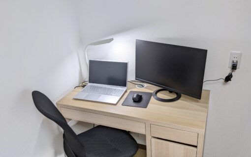 まず分電盤の空き容量と既存回路の負荷状況をチェック。その結果、既存回路からの分岐で対応可能と判断し、壁内配線を延長してデスク横へ新たにコンセントを増設しました。壁材の開口は最小限に抑え、仕上がりにも配慮しています。