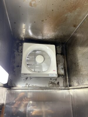 古い機器を撤去し、周囲の清掃を行った上で、最新の業務用換気扇へと交換いたしました。